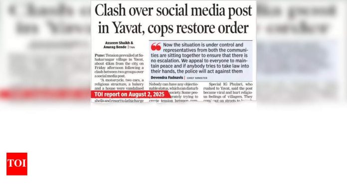 पुणे: वादग्रस्त सोशल मीडिया पोस्ट बनवणा the ्या तरुणांनी (२०) तब्बल १ people जणांना शनिवारी अटक करण्यात आली, शुक्रवारी दोन गटांमधील संघर्षानंतर शहरापासून सुमारे k 45 कि.मी.या संघर्षासंदर्भात १ 140० हून अधिक लोकांविरूद्ध पुणे ग्रामीण पोलिसांनी जाळपोळ, जातीय तणाव, दंगल आणि बेकायदेशीर असेंब्लीशी संबंधित एकूण पाच एफआयआर नोंदणी केली. पोलिस अधीक्षक (पुणे रूरल) संदीपसिंग गिल यांनी टीओआयला सांगितले की, “सहकारनगर व्हिलेज आणि युवातच्या बाहेरील वसाहतींमध्ये या गुन्हेगारीत निर्माण झालेल्या गुन्ह्यातील वैयक्तिक भूमिकांची पडताळणी केल्यानंतर दोन गटातील चार जणांना अटक करण्यात आलेल्या एकाधिक पोलिस पथकांनी आणि युवकाच्या सोशल मीडियाच्या पोस्टमध्ये या गुन्हेगारीच्या वैयक्तिक भूमिकांची पडताळणी केल्यानंतर दोन गटांना अटक केली.“ते म्हणाले, “सध्या दौंड तालुकामध्ये राहणा Nand ्या नांडेडमधील तरुणांना पाचव्या एफआयआरमध्ये सोशल मीडिया पोस्टसाठी अटक करण्यात आली होती. आम्ही त्याला पोस्टमागील हेतू स्थापित करण्यासाठी त्याला प्रश्न विचारत आहोत.”दौंड मॅजिस्टरियल कोर्टाने 5 ऑगस्टपर्यंत पोलिसांच्या ताब्यात असलेल्या तरुणांना रिमांड केले. बाकीच्यांना 6 ऑगस्टपर्यंत पोलिसांच्या ताब्यात पाठविण्यात आले.शुक्रवारी मोटारसायकल, दोन कार, एक धार्मिक रचना, एक बेकरी आणि घराची तोडफोड केली गेली.गिल म्हणाले, “आम्ही सीसीटीव्ही कॅमेर्याच्या फुटेजचे विस्तृत विश्लेषण केले आहे, साक्षीदार आणि माहिती देणा from ्यांकडून माहिती गोळा केली आहे आणि गुन्ह्यात सहभागी असलेल्या जवळपास 35 ते 40 पुरुषांची ओळख स्थापित करण्यासाठी काही संकेतांवर काम केले आहे. शक्य तितक्या लवकर पोलिस पथकांना अटक करण्यासाठी. इतर अज्ञात लोकांची ओळख स्थापित करण्याची प्रक्रिया प्रगतीपथावर आहे.”ते म्हणाले, “सोशल मीडिया पोस्ट पूर्णपणे नियंत्रित झाल्यानंतर तणाव निर्माण करणारी कायदा व सुव्यवस्था परिस्थिती. कायदा व सुव्यवस्थेच्या परिस्थितीचा विचार केल्यावर रविवारी भारतीय नगरिक सुरक्षा संहिता यांच्या कलम १33 च्या तरतुदीनुसार जारी केलेल्या निषिद्ध आदेशाचा आढावा घेण्यात येईल. “एकूण २०० पोलिस, राज्य राखीव पोलिस दलाचे plol 75 कर्मचारी असलेले एक प्लाटून, प्रत्येकी १२ पोलिस आणि तीन दंगल नियंत्रण युनिट्स असलेले तीन धडक दल गावात आणि त्यातील बाह्य वसाहती प्रतिबंधक उपाय म्हणून तैनात करण्यात आले होते, असे गिल यांनी सांगितले. ते म्हणाले की, गावक of ्यांच्या मनात आत्मविश्वास वाढवण्यासाठी पोलिसांनी एक मार्ग मोर्चा काढला आणि यावत भागात शांतता राखण्यासाठी त्यांच्याबरोबर स्प्लिंटर गटात बैठक घेतली.