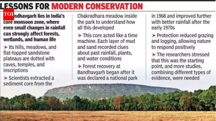 पुणे : मध्य प्रदेशातील बांधवगडच्या जंगलात खोलवर मातीत लिहिलेली एक लांबलचक आणि आश्चर्यकारक कथा वैज्ञानिकांना सापडली आहे. गाळाचा अरुंद गाभा, फक्त 60 सेमी लांब, संशोधकांना सुमारे 2,600 वर्षांपासून या प्रदेशातील लोकांवर हवामानाचा कसा प्रभाव पडला हे शोधण्यात प्रवृत्त केले. हवामानातील बदल आपोआपच समाजाच्या पतनास कारणीभूत ठरतात या सामान्य समजाला त्यांचे निष्कर्ष आव्हान देतात. होलोसीन जर्नलमध्ये नुकतेच प्रकाशित झालेले हे संशोधन लोक आणि निसर्गाने दीर्घकाळ एकत्र कसे काम केले हे समजून घेण्यासाठी केले गेले.बीरबल साहनी इन्स्टिट्यूट ऑफ पॅलेओसायन्सेस, अशोका विद्यापीठ, आघारकर संशोधन संस्था, भारतीय उष्णकटिबंधीय हवामानशास्त्र संस्था आणि वैज्ञानिक आणि नाविन्यपूर्ण संशोधन अकादमीच्या शास्त्रज्ञ आणि इतिहासकारांनी हे संशोधन केले आहे.पेपरमध्ये म्हटले आहे, “आज, बांधवगड हे व्याघ्र प्रकल्प म्हणून प्रसिद्ध आहे. पण ते संरक्षित जंगल बनण्याच्या खूप आधी, ते लोक राहत होते, शेती करत होते, गुहा आणि मंदिरे बांधत होते आणि शतकानुशतके बदलत असलेल्या पावसामुळे पाण्याचे व्यवस्थापन करत होते. अभ्यासातून असे दिसून आले आहे की हवामानातील बदलांनी पर्यावरणाला आकार दिला असताना त्यांनी मानवी नशिबाचा निर्णय घेतला नाही.”अशोका विद्यापीठाच्या आंतरविद्याशाखीय पुरातत्व संशोधन केंद्राचे नयनजोत लाहिरी, अभ्यासाच्या सह-लेखकांपैकी एक, म्हणाले, “हवामानातील बदल असूनही, प्राचीन काळापासून मध्ययुगीन काळातील मानवी व्यवसायाचा विस्तार येथे एक स्थिर आहे. बदलत्या पर्यावरणीय परिस्थितींसह, मानवी जीवनाची छाप मोठ्या प्रमाणात वाढली आहे.”संघाने पाच वैज्ञानिक पद्धती वापरल्या: खनिज चुंबकत्व, धान्य-आकाराचे विश्लेषण, डायटॉम्स (लहान पाण्याची वनस्पती), परागकण विश्लेषण आणि मूलभूत रसायनशास्त्र.डेटाचा वापर करून, संशोधकांनी 525 बीसीई पासून आजपर्यंत पाच प्रमुख हवामान टप्पे ओळखले. महत्त्वाचे म्हणजे, त्यांनी प्रथम हवामानातील बदल स्वतंत्रपणे मॅप केले आणि नंतरच त्यांची तुलना पुरातत्व इतिहासाशी केली.सुरुवातीच्या टप्प्यात, सुमारे 2,700 आणि 2,400 वर्षांपूर्वी, ओल्या आणि कोरड्या परिस्थितींमध्ये वारंवार बदल घडत होते. दगडी उपकरणे शिकारी-संकलक उपस्थित असल्याचे दर्शविते, तर अन्नधान्य परागकण सूचित करतात की शेती आधीच सुरू झाली आहे. ओल्या काळात, ओलसर पर्णपाती जंगले संपूर्ण प्रदेशात विस्तारली.दुसरा टप्पा, सुमारे 2,400 ते 1,700 वर्षांपूर्वी, कोरडा झाला. पाण्याची पातळी घसरली आणि वनस्पतींनी तणावाची चिन्हे दर्शविली. तरीही जेव्हा मोठ्या प्रमाणात खडक कापलेल्या गुहा दिसू लागल्या तेव्हा हे देखील घडले. मानवी क्रियाकलाप कमी झाला नाही,
