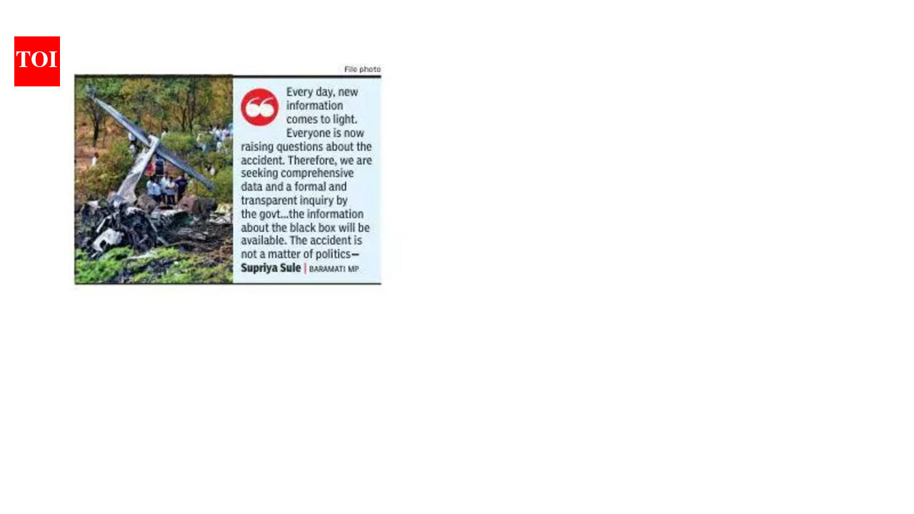 “ब्लॅक बॉक्सची माहिती मिळेल. अपघात हा राजकारणाचा विषय नाही,” असे सांगून त्या म्हणाल्या की, अजितदादांना खरी श्रद्धांजली हीच त्यांच्या विकासाच्या अजेंड्याला कामातून चालना देणार आहे.या अपघाताबाबत पत्रकार परिषद घेणारे राष्ट्रवादीचे (सप) आमदार रोहित पवार या प्रकरणाचा शास्त्रीय पाठपुरावा करत असल्याचेही सुळे म्हणाल्या. “मृत्यूमुळे तो खूप हळहळला आणि भावूक झाला. त्याने आपले काका गमावले आणि त्याला सत्य जाणून घ्यायचे आहे,” ती म्हणाली.राष्ट्रवादीचे (एसपी) अध्यक्ष शरद पवार यांना पुन्हा राज्यसभेवर उमेदवारी दिली जात आहे का, असे विचारले असता सुळे म्हणाल्या की, एमव्हीए सदस्य येत्या काही दिवसांत बैठक घेऊन नाव निश्चित करतील.नागरी समस्यांबाबत त्या म्हणाल्या की, वडगावमधील सभागृह आणि शाळा यासारखे प्रकल्प दशकाहून अधिक काळ प्रलंबित आहेत आणि ते प्राधान्याने राबविले पाहिजेत. सिंहगड रोड आणि कात्रज उड्डाणपुलाचे बांधकाम, दुरुस्ती आणि विस्तारीकरणाचे कामही लवकरात लवकर पूर्ण करावे, असे सुळे म्हणाल्या, त्यामुळे वाहतूक कोंडी कमी होण्यास मदत होईल.पाटबंधारे खाते आणि महापालिका एकाच पानावर असली पाहिजेत. ते एकाच सरकारचे भाग आहेत आणि त्यांच्यातील मतभेद हे आरोग्यदायी लक्षण नाही. मुख्यमंत्र्यांनी या प्रकरणात हस्तक्षेप करायला हवा, असे खासदारांनी शहरातील अपुऱ्या पाणीपुरवठ्यावर प्रश्नांना उत्तर देताना सांगितले.शिवाजीनगरमधील गुडलक चौकाजवळील ‘कलाकार कट्टा’ ही मोकळी जागा, जी कलाकारांना त्यांच्या कलागुणांचे प्रदर्शन करण्यासाठी नियुक्त करण्यात आली आहे, ती स्थलांतरित करू नये, असे त्या म्हणाल्या. भाजप नगरसेवकांनी स्थलांतराची मागणी केली.सुळे म्हणाल्या, विलीन झालेल्या भागात मालमत्ता कर वाढवणे योग्य नाही. “नागरी प्रशासन या भागात पुरेशा सुविधा पुरवत नाही, त्यामुळे कर वाढ (प्रस्तावित) समर्थनीय नाही,” ती पुढे म्हणाली.