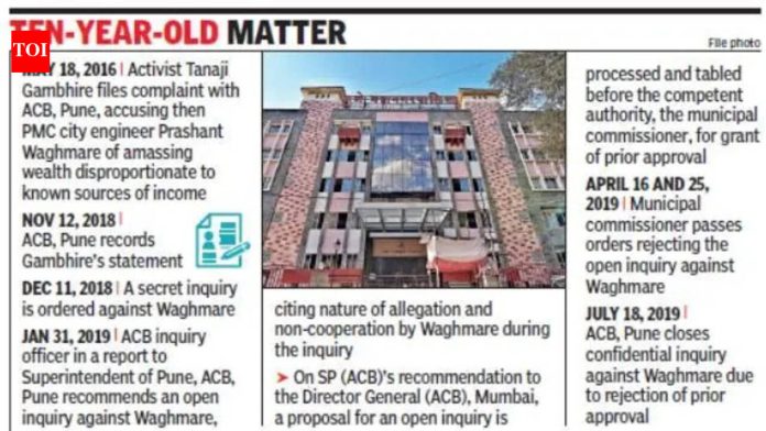पुणे: मुंबई उच्च न्यायालयाने 16 आणि 25 एप्रिल 2019 चे पुणे महापालिका आयुक्तांचे आदेश रद्दबातल ठरवले आहेत, ज्यामध्ये राज्य लाचलुचपत प्रतिबंधक विभागाने (एसीबी) माजी शहर अभियंता प्रशांत वाघमारे यांच्या ज्ञात उत्पन्नाच्या स्रोतापेक्षा बेहिशोबी मालमत्ता जमवल्याच्या आरोपावरून केलेली खुली चौकशी नाकारली आहे.न्यायमूर्ती ए एस गडकरी आणि न्यायमूर्ती रणजितसिंह राजा भोसले यांच्या खंडपीठाने 2 एप्रिल रोजी सांगितले की, बेहिशोबी मालमत्ता (DA) प्रकरणात खुल्या चौकशीसाठी पूर्वपरवानगी आवश्यक नाही आणि PMC प्रमुखांनी, पूर्व मंजुरीसाठी सक्षम अधिकारी म्हणून, त्यांचे अधिकार क्षेत्र ओलांडले आणि प्रकरणाची सुनावणी रोखून धरली.वाघमारे यांच्या विरोधात खुल्या चौकशीसाठी याचिकाकर्त्याच्या प्रार्थनेला परवानगी देताना खंडपीठाने सांगितले की, “खुली चौकशी केल्यानंतर अधिकारी भ्रष्टाचार प्रतिबंधक कायद्यात नमूद केलेल्या प्रक्रियेचे आणि प्रक्रियेचे पालन करतील आणि कायद्यानुसार जलद आणि योग्य कारवाई करतील.” खुल्या चौकशीत वाघमारेविरुद्ध कोणताही खटला चालवण्याजोगा पुरावा आढळल्यास खटला चालवण्याच्या परवानगीसाठी ACB ला पुन्हा सक्षम अधिकाऱ्याकडे जावे लागेल.नंतर, पीएमसीच्या वकिलाच्या विनंतीवरून, खंडपीठाने नागरी प्रशासनाला सर्वोच्च न्यायालयात अपील करण्यास सक्षम करण्यासाठी त्याच्या निर्णयावर दोन आठवड्यांची स्थगिती दिली.“आम्ही DA प्रकरणाची चौकशी करणाऱ्या तृतीय पक्ष व्यक्तींद्वारे उच्च न्यायालयाच्या निकालाचे राज्यव्यापी परिणाम लक्षात घेऊन आणि सरकारी अधिकाऱ्यांना त्रास देण्यासाठी किंवा त्यांच्यावर दबाव आणण्याचे साधन म्हणून वापरणे लक्षात घेऊन SC मध्ये अपील दाखल करणार आहोत. तसेच, PMC प्रमुखांचे खोटे आदेश सरकारी निर्णय, 3 मार्च 2010 च्या सक्तीच्या निर्णयानुसार होते. पूर्वपरवानगी देण्यापूर्वी किंवा नाकारण्यापूर्वी चौकशी करा,” पीएमसीचे प्रतिनिधीत्व करणारे वकील अभिजित कुलकर्णी यांनी TOI ला सांगितले.तानाजी गंभीरे यांनी 2021 मध्ये हायकोर्टासमोर याचिका दाखल केली होती आणि आरोप केला होता की वाघमारे यांना पीएमसी संरक्षण देत आहे, ज्यांनी त्यांच्या ज्ञात उत्पन्नाच्या स्त्रोतांपेक्षा अनेक कोटी रुपयांची संपत्ती जमा केली आहे.खंडपीठाने म्हटले आहे की, “पीसी ॲक्टच्या कलम 17(ए) अंतर्गत सक्षम प्राधिकाऱ्याने, संकलित केलेली सामग्री, चौकशी किंवा चौकशी किंवा तपासासाठी योग्य आहे की नाही हे सत्यापित करणे आवश्यक आहे आणि हे केवळ तेव्हाच केले जाऊ शकते जेव्हा कथित गुन्हे ‘सरकारी कार्ये किंवा कर्तव्ये पार पाडताना लोकसेवकाने केलेल्या शिफारशीशी संबंधित किंवा घेतलेल्या निर्णयाशी संबंधित आहेत’ आणि इतर श